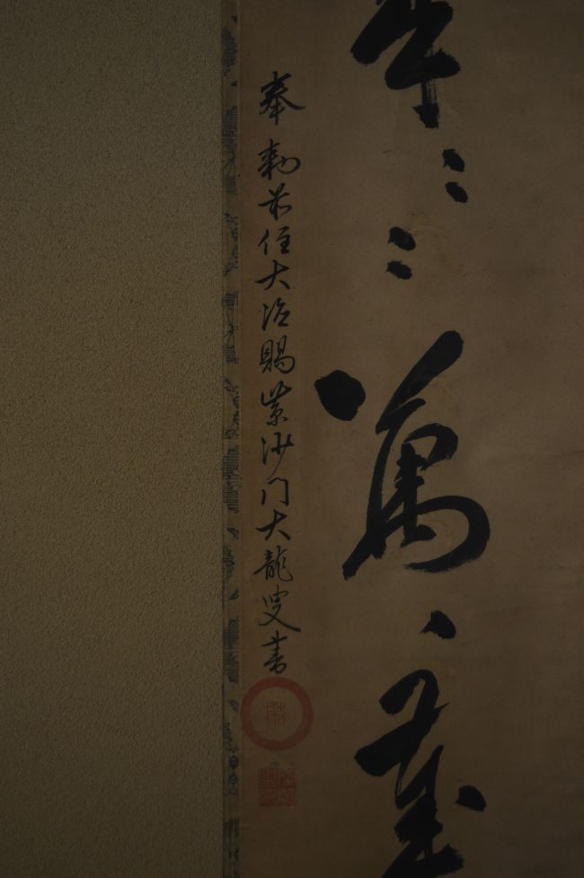 | 説明 | 《萬歳萬歳萬々歳》 《奉勅前住大徳賜業沙門大龍叟書》 【大瀧宗丈】 元禄5年(1692)~寛延4年(1751) 大徳寺341世 玉林院住職 号簑庵 *茶の湯を好み、如心斎・一燈・不白などの参禅の師として知られる。号の簑庵は玉林院内に大坂の豪商鴻池了瑛(りょうえい)が造えした表千家7世如心斎宗左の好みによる茶室。 |